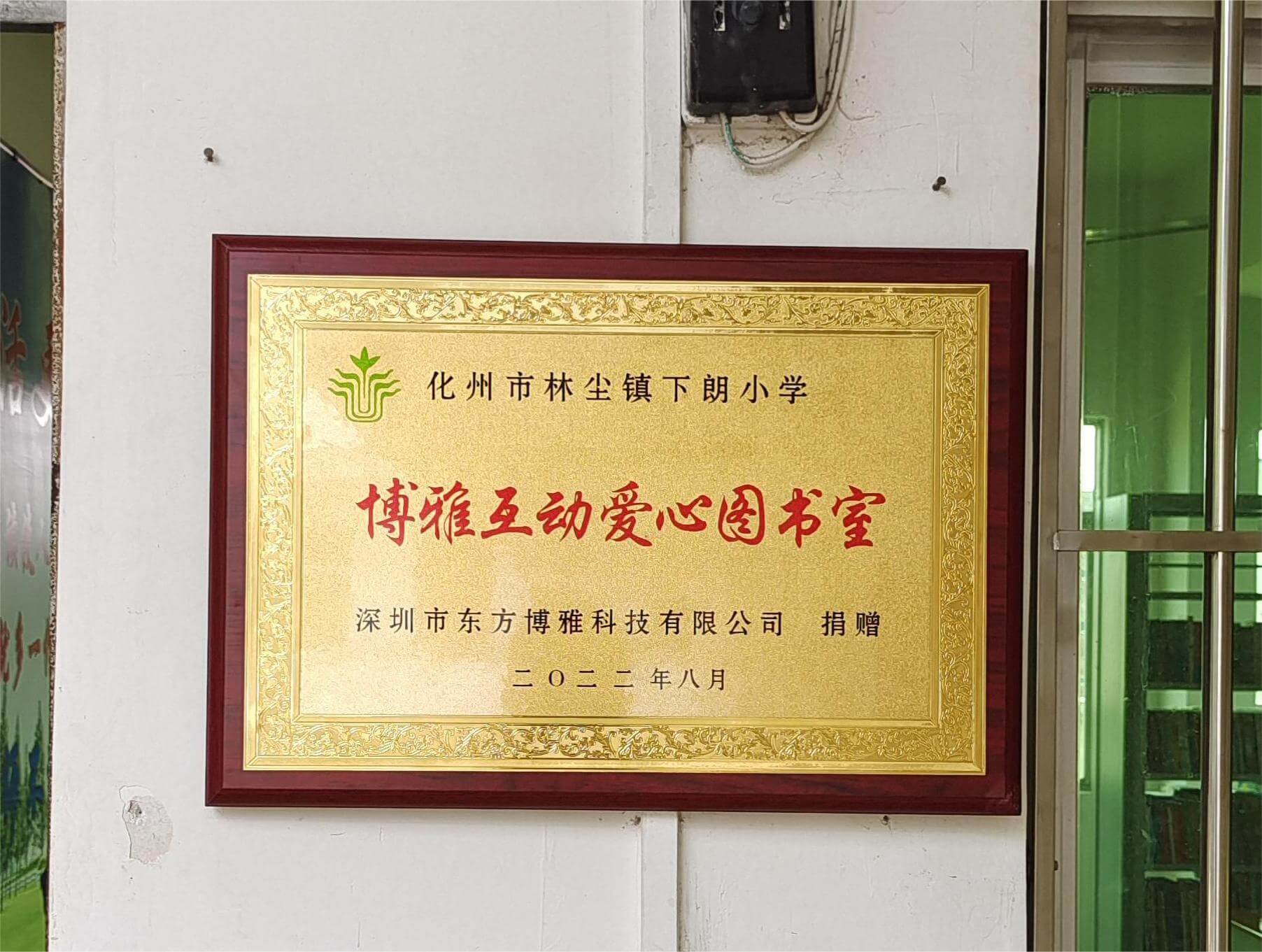 “知识改变命运,读书成就未来,扶贫贵在扶智”,博雅互动通过省教育基金会了解到,我省粤东西北山区县农村学校有图书缺乏的困难,为支持学校建设书香校园、 提升教学质量,博雅互动决定资助建设“爱心图书室”,让农村学校的孩子有书读、读好书。博雅互动此次向其中1所农村学校——化州市林尘镇下朗小学捐赠3500册及3组图书架,于今年7月启用。