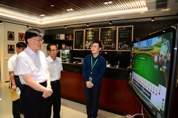 工作人员向徐友军副主席演示博雅互动棋牌游戏