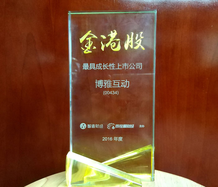 1月13日,由智通财经、同花顺财经联合主办的2016年度“金港股”评选颁奖典礼在深圳广电集团大厦隆重举行,博雅互动作为唯一一家专精于互联网棋牌游戏领域的上市企业受邀参与,并荣获“最具成长性上市公司”奖。