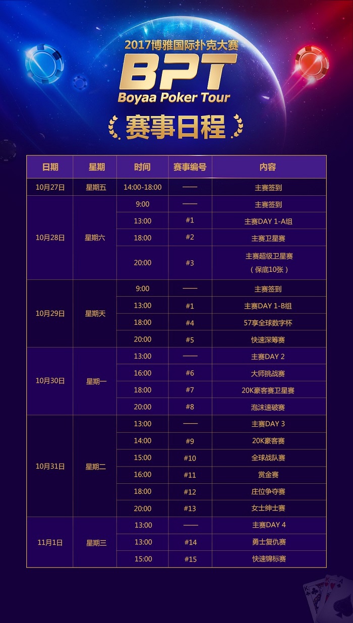 与丰厚的赛事奖励相得益彰的,还有丰富多元的赛程安排。主赛事赛程设为Day1-A组,Day1-B组,Day2,Day3,Day4,全程5天。其中Day1-A组及Day1-B组分别在10月28日及29日开始,两组分别角逐晋级Day2的赛事资格。随后逐日晋级,向Final Table发起冲击,最终争夺冠军奖励。5天赛期内,除了常规的主赛外,还将有十余场附加赛供选手参与,如规则新颖有趣的「主赛卫星赛」、「泡沫速破赛」、「赏金赛」等锦标赛,「全球战队赛」等特别邀请赛,都将让此次参赛的选手享受到最优体验。