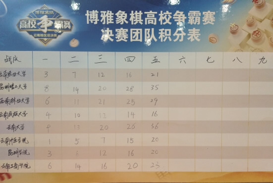 17日,博雅象棋高校争霸赛云南地区总决赛在云南农业大学文韵堂火热开赛,各高校战队明暗交锋,比赛现场气氛如火如荼。前五轮战罢,云南大学战队以出色的棋力获得36分团队总积分,以超出第二名昆明理工大学1分的微弱优势暂居首位,西南林业大学、云南工商学院分别暂居三四名。