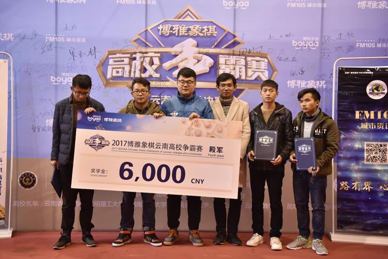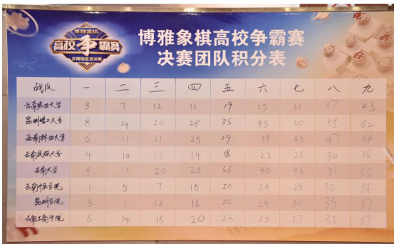 本次博雅象棋高校联盟争霸赛总决赛于17-18日连续两天进行,八支战队共需进行9轮比赛,依照每队选手的积分总和进行排名。决赛第一天前5轮比赛结束,云南大学、昆明理工大学、西南林业大学、云南工商学院暂居前四位。