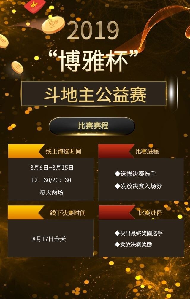 2019年,博雅互动公益行动重新出发,举办“博雅杯”2019斗地主公益赛,本次赛事将于8月6日~8月15日正式开始线上海选,希望广大牌友既能体验到线上玩牌的便捷的同时,又能延续线下棋牌的乐趣。