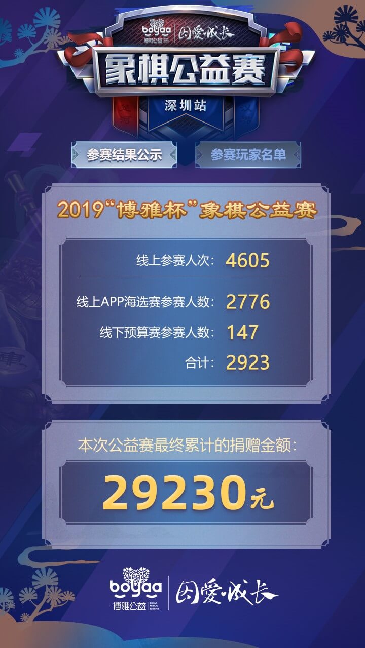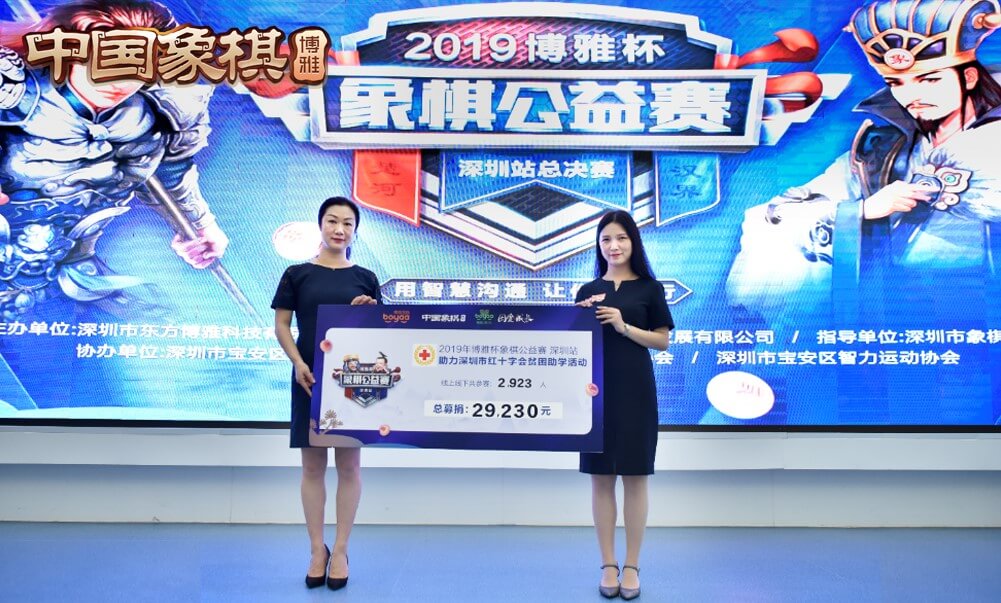 在公布排名之前,还有更有意义的事情要继续。此前关注“博雅杯”象棋公益赛的的朋友应该都知道,本次赛事除了为广大棋友营造一个线上线下互相交流的平台外,同时秉承履行社会责任,倡导和鼓励用户为积极参与到公益事业中。从线上线下海选到总决赛,本次赛事的每一位参赛者都是本次公益事业的重要助力者!博雅互动代表每一位参赛者(不重复计算)捐出10元公益金,截止至决赛,博雅互动累计捐赠29230元给深圳市红十字会用于开展红十字贫困助学活动,帮助更多的学子享有公平而有质量的教育机会。