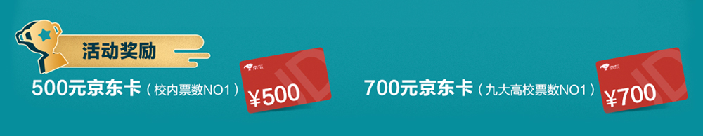 第一阶段各校战队代言人选拔中,男女票数第一均可获得500元京东购物卡。